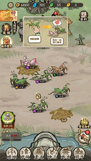 1、进入游戏后,玩家即可开始培养属于自己的螳螂。将两只螳螂拖拽到一起即可进行繁育,从而获得品质更高的新螳螂。