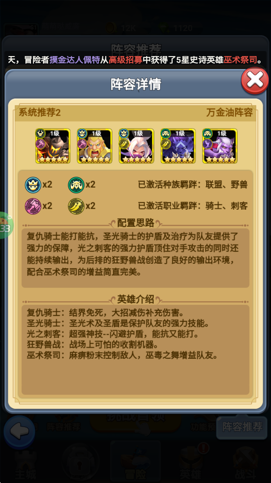 阵容组成:圣光骑士+嗜血狼人+光之刺客+狂野兽战+月神祭司