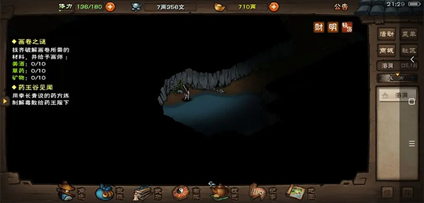 2、从猪圈右边一格用轻功,跳上读书岩进入山洞,水上漂到(4,3)处的潭水等待落水就可以进入溶洞了。