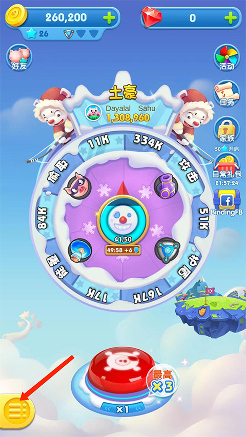 1、打开猪来了游戏,选择左下角【三条杠】图标,