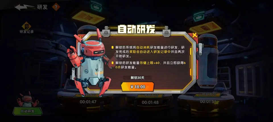 通关2-6,就会解锁一个功能叫作研发,很香,每2分钟可以产出各种资源,抽卡券都可以出几十抽。有条件的可以买个自动研发特权,可以每天多一些资源。