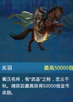 蜀汉名将,有”武圣"之称,忠义千秋。捕获后最高获得50000倍金币奖励。