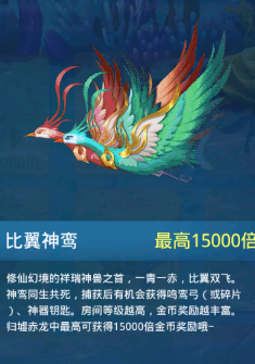 修仙幻境的祥瑞神兽之首,一青一赤,比翼双飞。神鸾同生共死,捕获后有机会获得鸣弯弓(或碎片)、神器钥匙。房间等级越高,金币奖励越丰富。归城赤龙中最高可获得15000倍金币奖励哦-