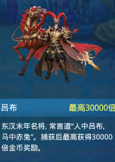 东汉末年名将,常言道”人中吕布,马中赤兔”。捕获后最高获得30000倍金币奖励。