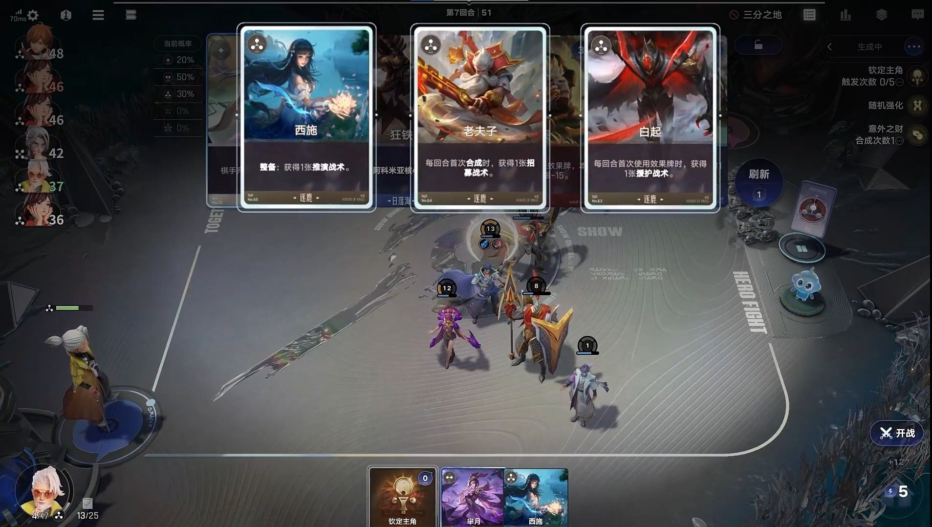 5、第四回合左右升至3级,开始补齐西施、老夫子、白起等核心辅助单位,为中期发力铺路。