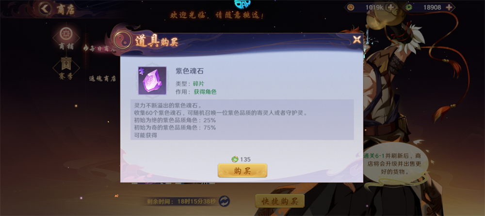 灵力不断溢出的紫色魂石,收集60个紫色魂石,可随机召唤一位紫色品质的寄灵人或者守护灵。