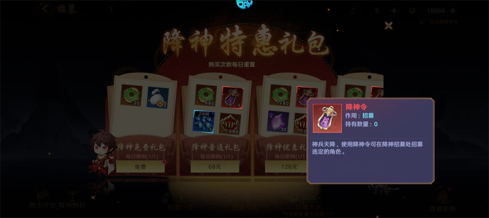 神兵天降,使用降神令可在降神招募处招募选定的角色