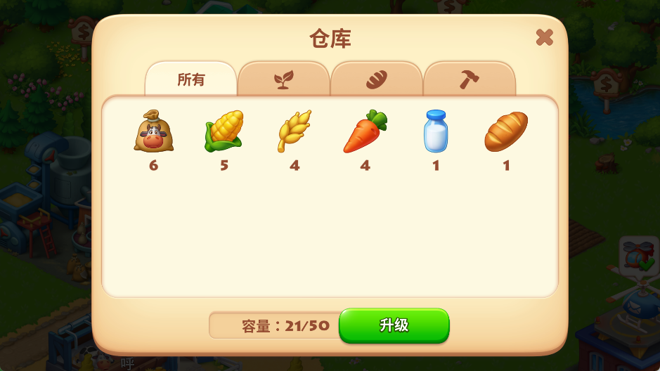 小麦:免费种植,生长仅需2分钟。新手玩家可以反复种植并出售小麦来积累金币。注意仓库容量有限,要合理管理库存。