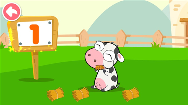4、我们选择小奶牛的农场去看看吧,可以看到地上有四捆草需要点击草垛喂奶牛从而知道如何识数;