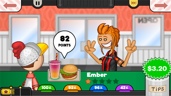 1、完成餐品制作后,将餐品交给顾客。系统会根据各环节的完成度给出评分与小费。新手期建议优先保证裹粉与油炸环节的100%完成度,减少失误,逐步提升其他环节的完成度,确保顾客满意并获得更高的小费。