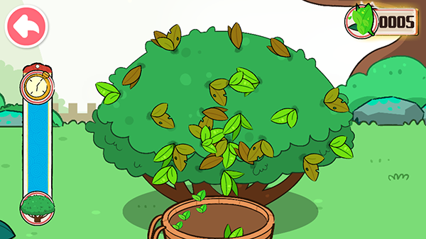 3、点击树上的绿色叶子,收集新鲜茶叶,左边是时间条,要在时间耗尽前尽可能收集多的茶叶。