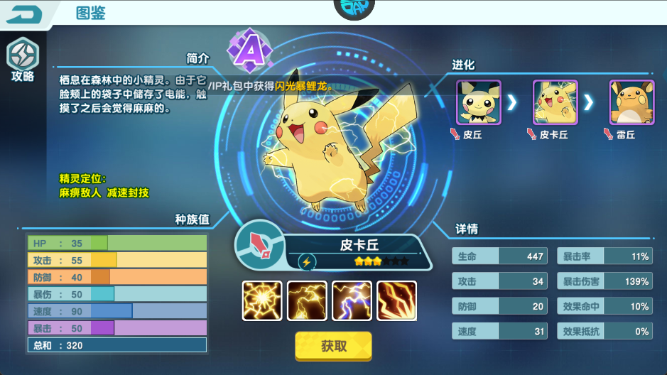 栖息在森林中的小精灵,由于它脸颊上的袋子中储存了电能,触摸了之后会觉得麻麻的。