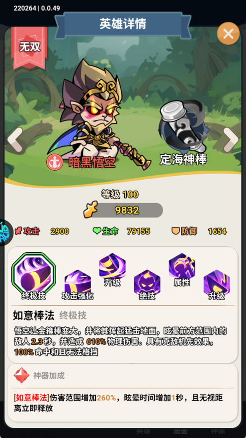 获取并培养英雄专属神器,如(孙悟空-定海神棒),不仅提升数值,还能解锁额外战斗效果。