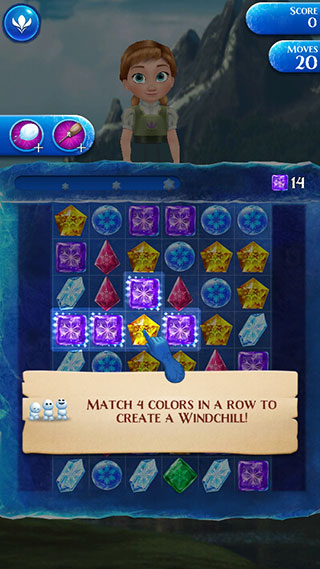 3、每个角色独有的升级系统:使用安娜的“火焰消除”烧尽整排冰晶,使用艾莎的“冰雪粉碎”来消除所有同色冰晶等