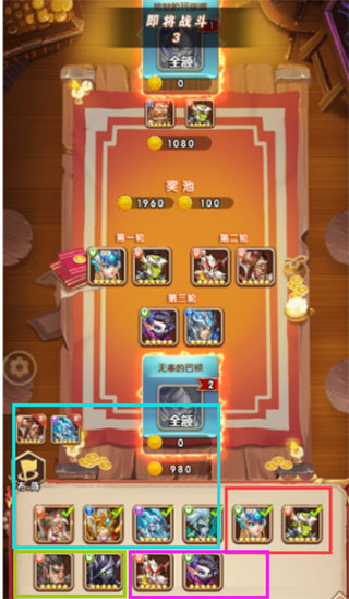 如图显示,蓝色框圈的是玩家的独立英雄牌,红色框第一轮的公共牌【双方都有海妖&巨魔】,绿色框第二轮的公共牌【双方都有万兽之王&暗夜君主】,紫色框第三轮【战神&暗影刺客】