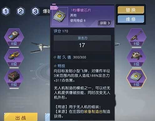 还有个和装备很近的系统,这里也介绍下,就是无人机,按理应该被归为功能类装备,十级就会解锁可使用,无人机有六个模块位置,对应输出,机动力,续航等属性。