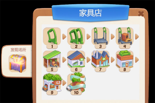 2、珍奇宝箱可以获得合成家具店生成器,通过合成:推车把手→推车底座→推车→带箱子的推车(带箱子的推车可以开始产出工具)→……以下类推。