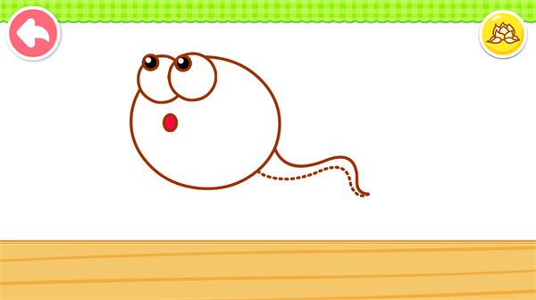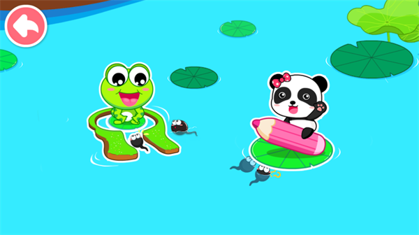 2、画一画:小蝌蚪长什么样?青蛙妈妈长什么样?还有金鱼、螃蟹、乌龟、熊猫,你还记得他们的样子吗?没关系,“画一画”中教你用简单的线条画出他们,还可以把他们放到池塘里哦。