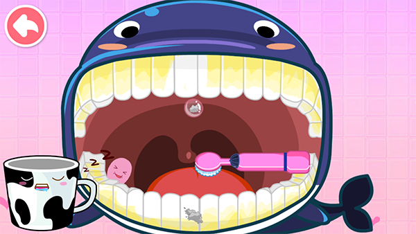 2、接下来,让宝宝操控牙刷帮助鲸鱼把它的牙齿刷干净,把细菌和牙垢都刷掉;在游戏中,宝宝需要用手指滑动屏幕,控制牙刷在鲸鱼的牙齿上来回刷动;通过这样的操作,宝宝可以感受到刷牙的乐趣,并且了解到刷牙的重要性;
