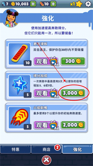点击商店里的强化,购买“得分加成”后在游戏中使用,可在短时间内提升倍数。