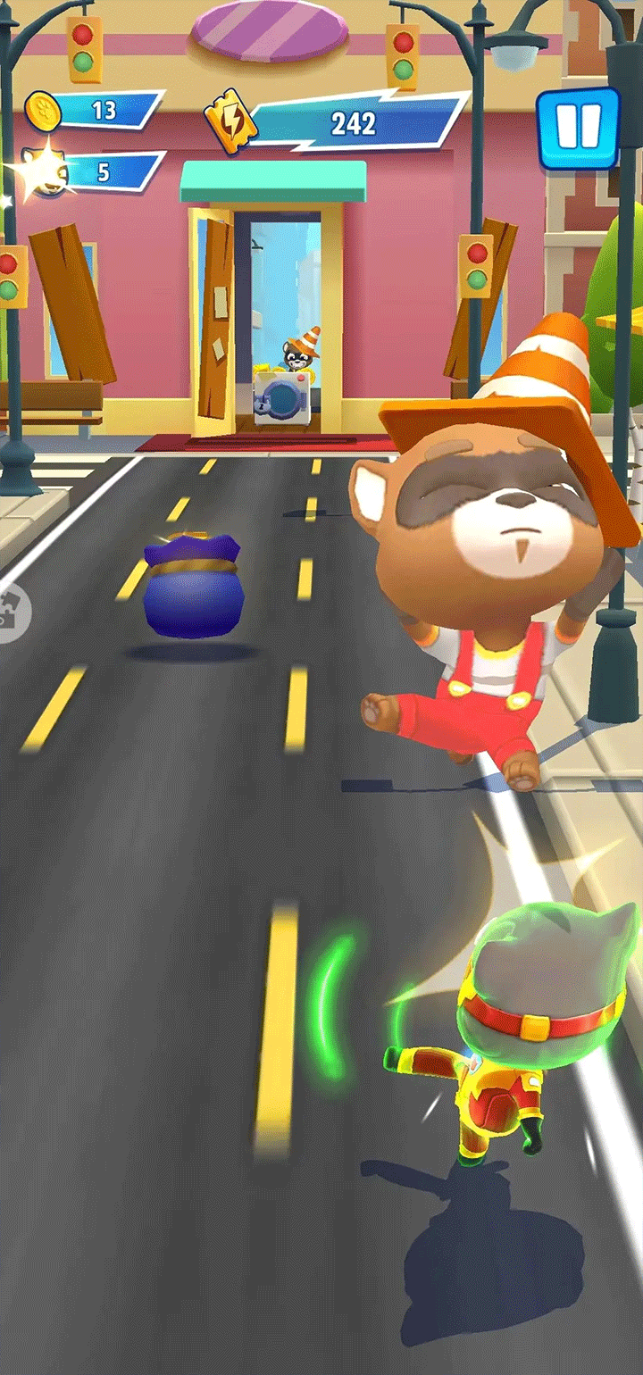 浣熊正在破坏整个世界。你需要把它们赶走,然后进行重建和清理。修好一个地方后,就要面对浣熊Boss。击败他,进入下一个跑酷世界!