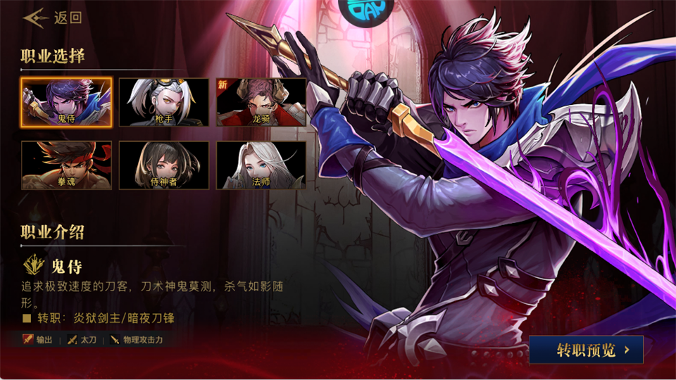 转职前可先看转职预览,了解技能定位,选择契合自己操作习惯的分支(如喜欢连招选暗夜刀锋,喜欢范围输出选炎狱剑主)。