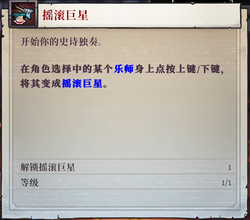 乐师的进阶是摇滚巨星,武器是电子诗琴,特效是需要动能。对物体进行回旋踢可获得动能。获得动能的同时获得充能状态(具有智慧加成)。和乐师原武器不一样的是,原武器可以发射一个音符在音符上进行无限的回旋踢,进阶武器就不行了,必须要先回旋踢充能才可以进行攻击,在对付一些特定怪的时候有奇效,但是在平常就不是很好用了。