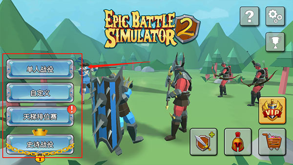 1、打开史诗战争模拟器2手机版,在主界面有单人战役、自定义、天梯排位赛和史诗战役四种模式,其中史诗战役是需要通过单人战役第50关才可以解锁的,小编这里以单人战役模式给大家大致介绍一下游戏玩法